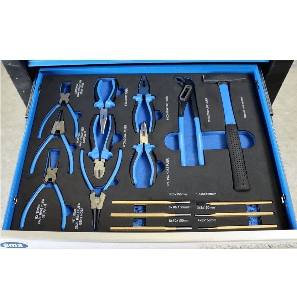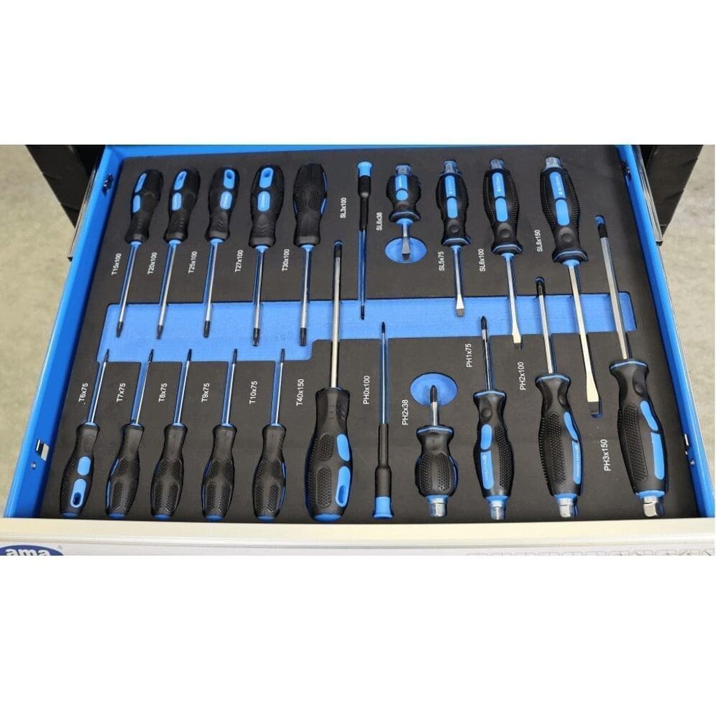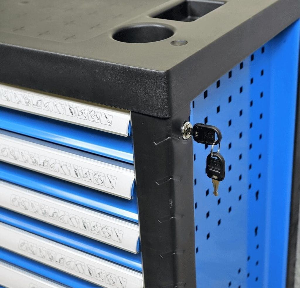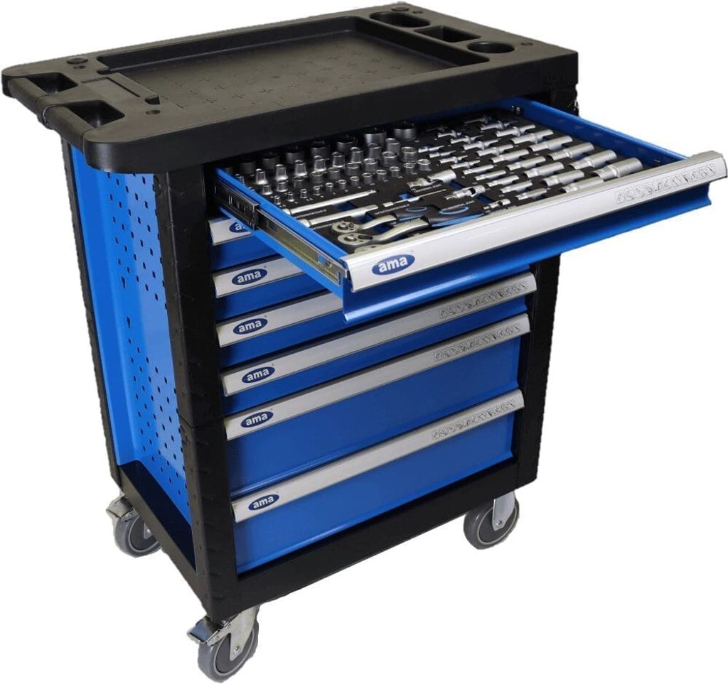 Med sju låsbara lådor, var och en fylld med högkvalitativa verktyg, erbjuder Ama verktygsvagn en perfekt balans mellan organisation och tillgänglighet. Varje verktyg är noga utvalt för att möta användarens behov, vilket säkerställer optimal effektivitet och produktivitet.