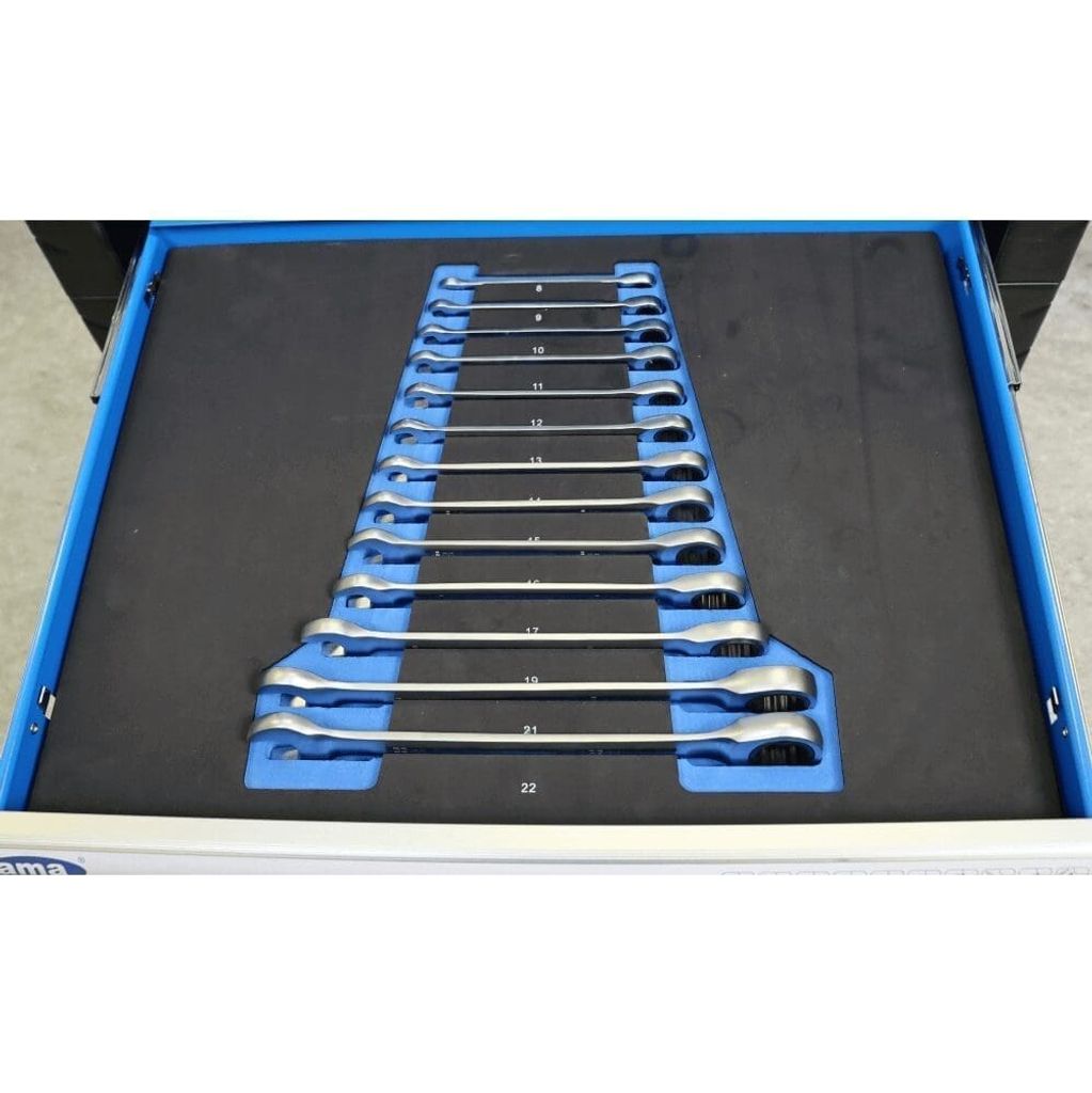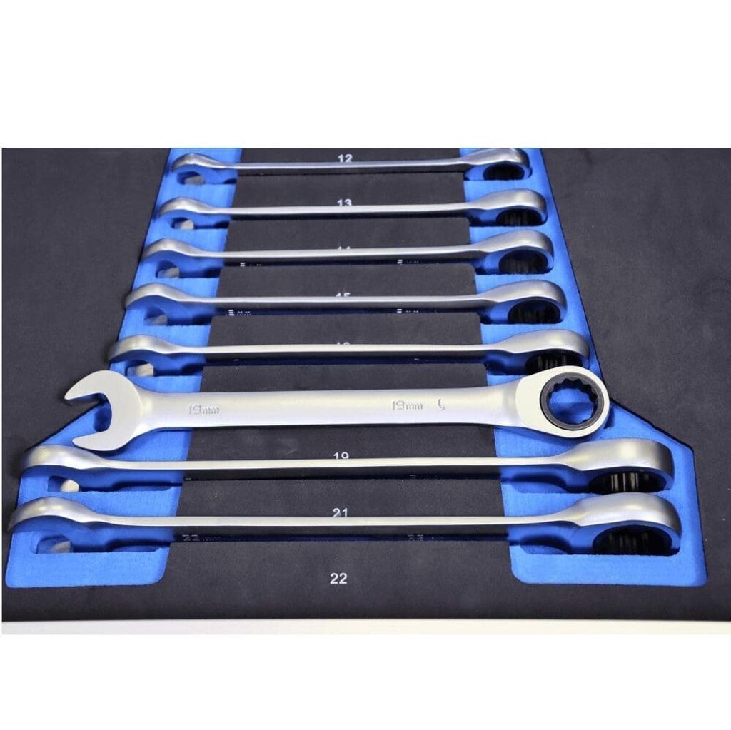 - Ringnycklar med spärr: 8, 9, 10, 11, 12, 13, 14, 15, 16, 17, 19, 21, 22 mm