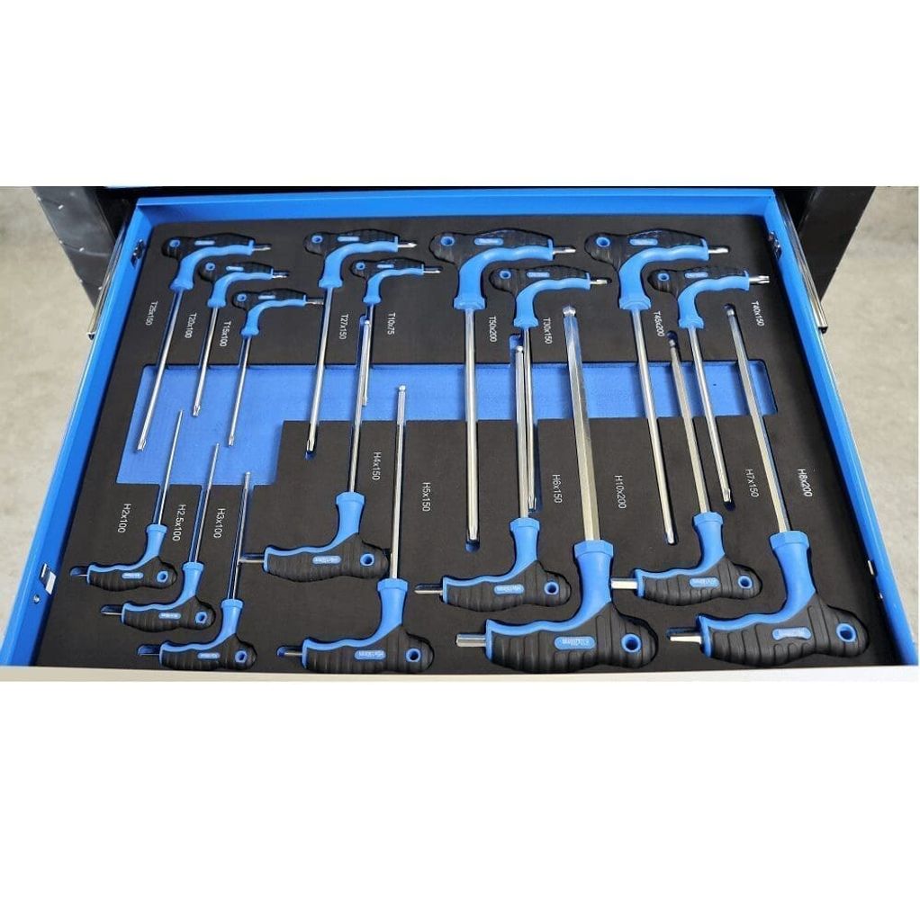 - 9 st Torxnycklar med T-handtag: T10, T15, T20, T25, T27, T30, T40, T45, T50