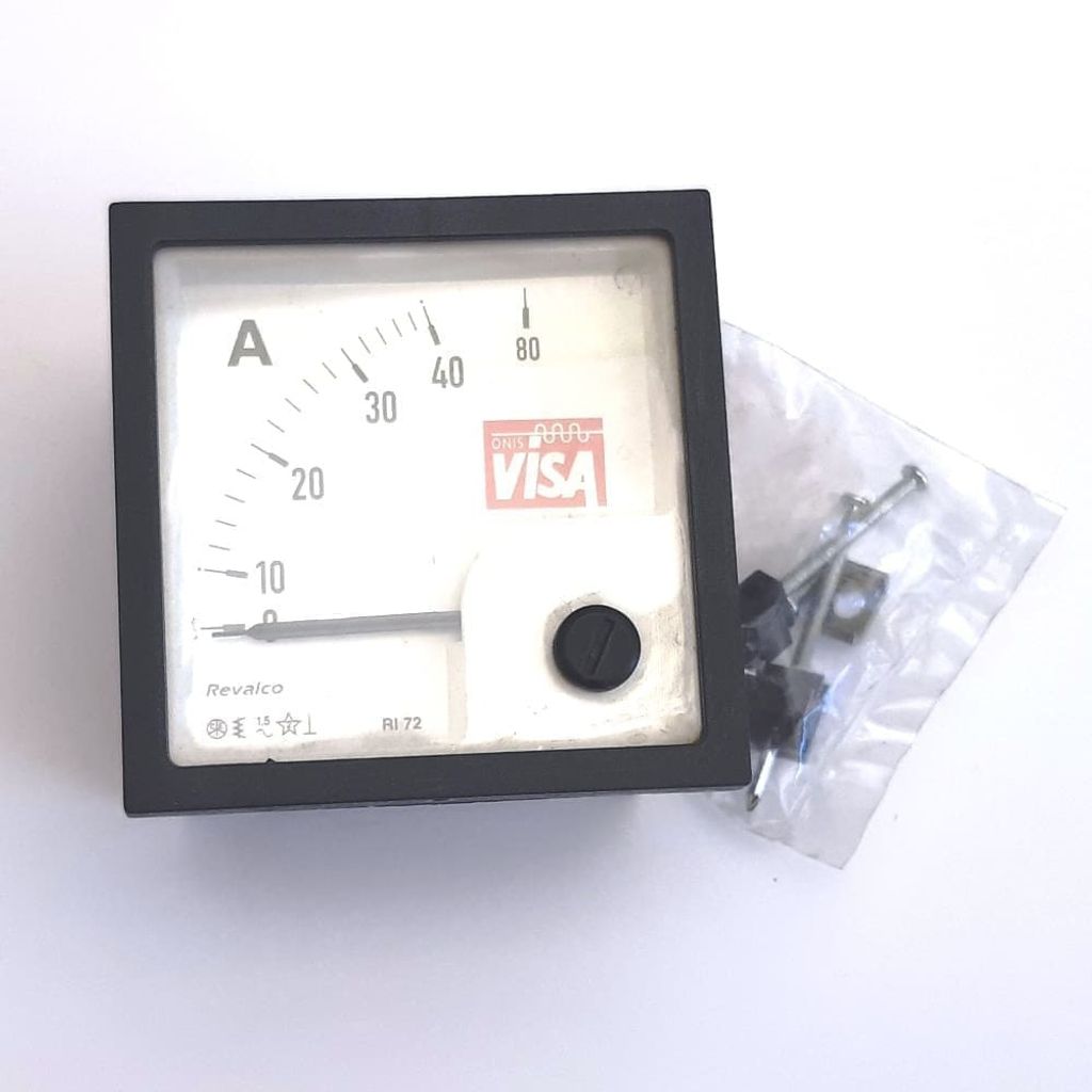Specifikationer/märkning: Revalco RI72 / CE A.C. Analogic Ammeter Range: 40A2 Lot: 46-98 Protection: IP 55 Dimension: 72 x 72 mm