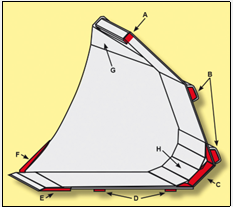 H: Innerplåten rundar skopan i bakkant så fyllning underlättas; detta är en stor fördel jämfört med invändiga stående plåtar som hindrar fyllning och tömning av skopan.