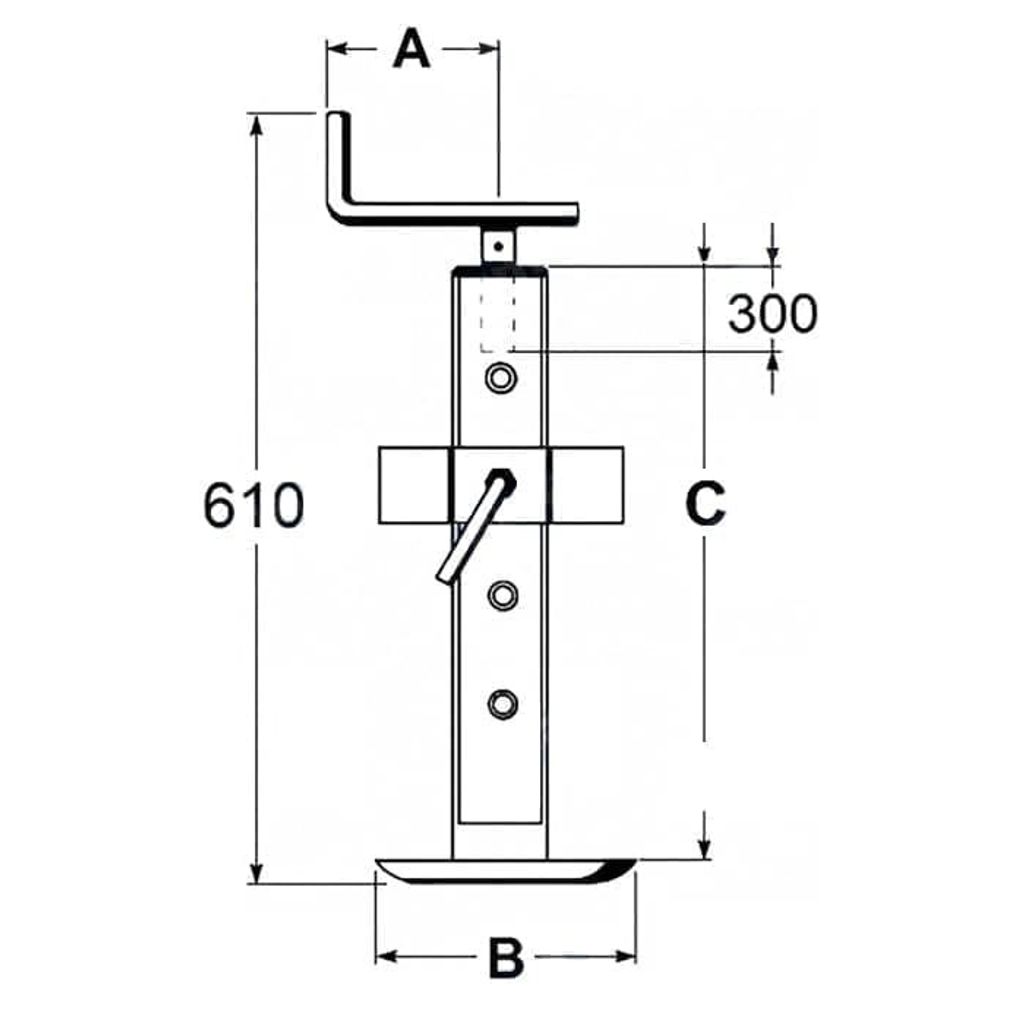 Teleskopisk stödfot med toppmonterad vev som klarar 1200 kg vertikal vikt. Med "snabbfäste" för att snabbt och enkelt få upp benet i transportläge.